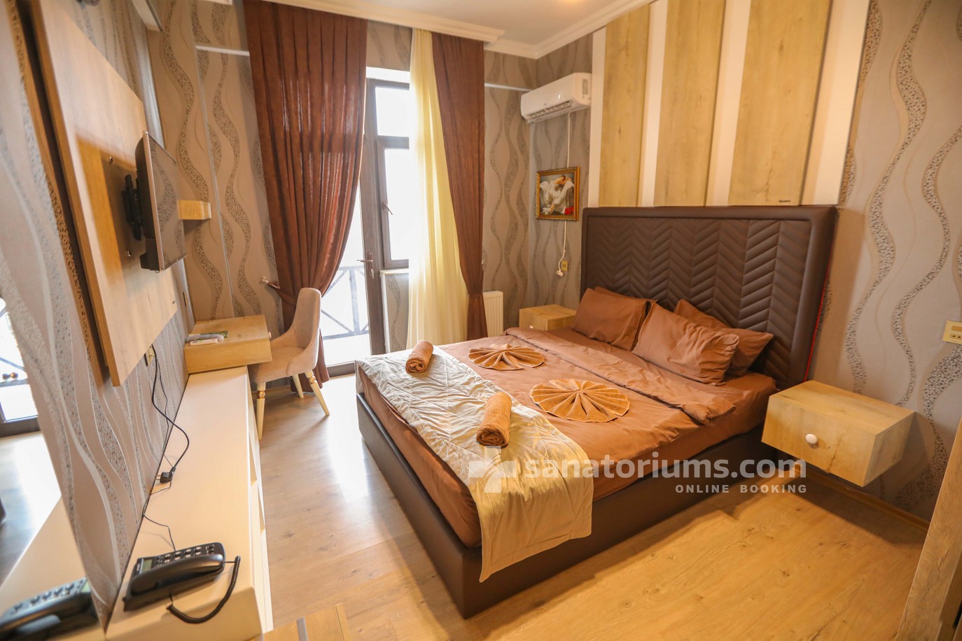 The hotel lobby, with 145 rooms, features modern design in light tones, accented with elegant black and gold shades. Floors include lounges for relaxation and spacious, stylish rooms ranging from 23 to 56 m², including Standard, Suite, Superior, and De Luxe types, all furnished with new furniture and equipped with climate control. A pleasant feature of the hotel is that every room has a balcony. Guests can enjoy TV, internet access, and beverages during their free time.